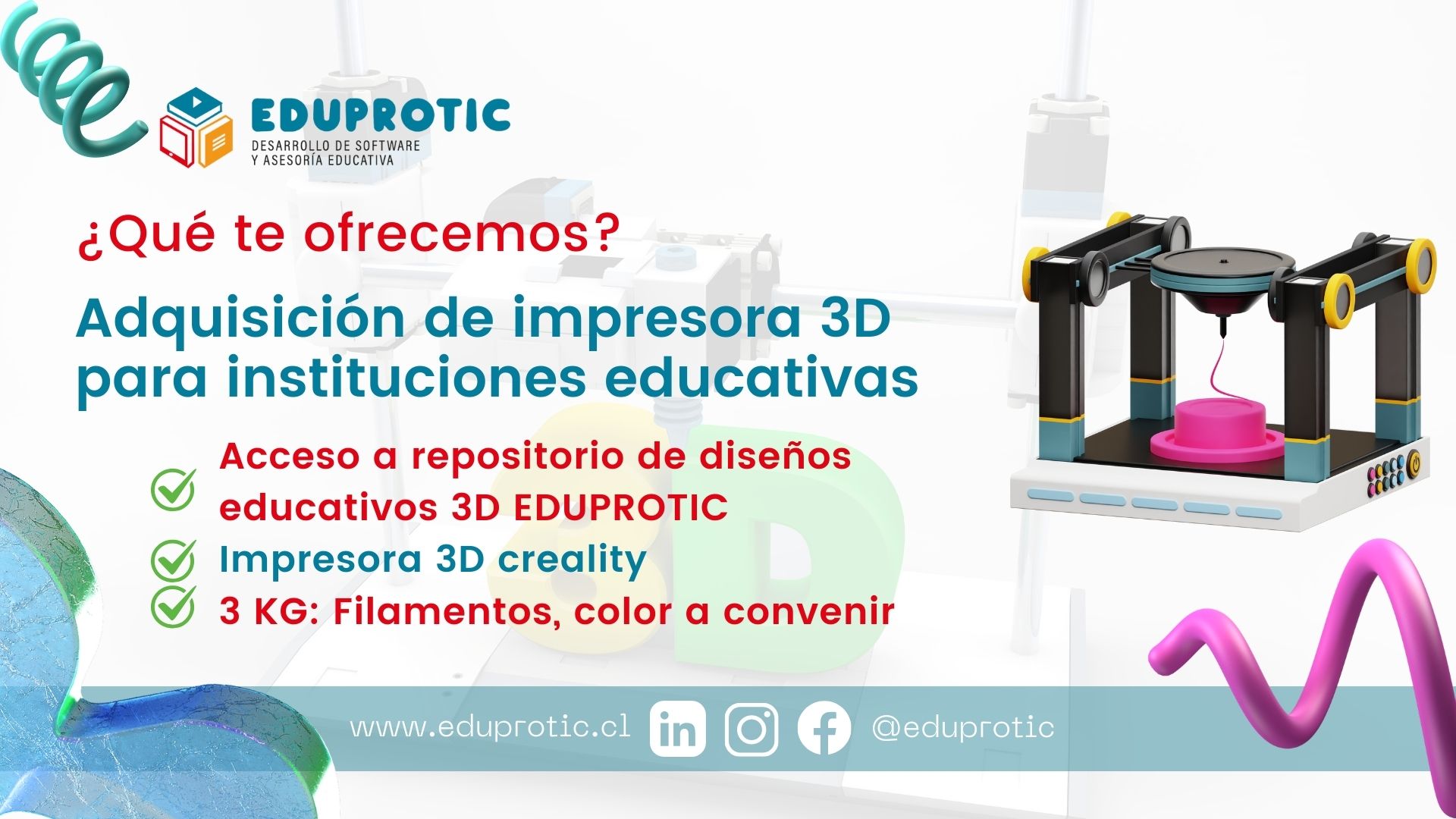 En Eduprotic ofrecemos la opción de adquirir impresoras 3D y junto a ello entregar las herramientas y recursos para una óptima implementación.