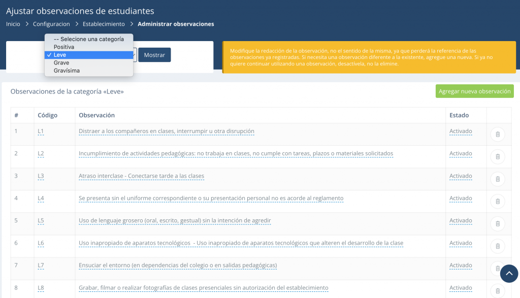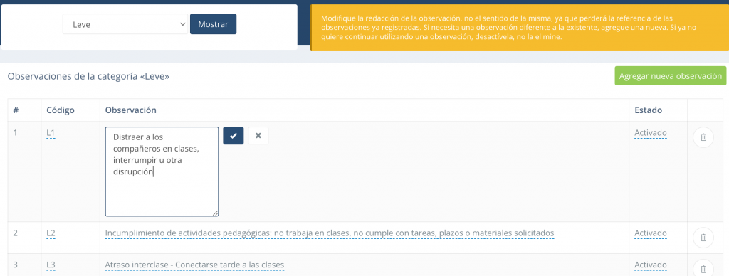 ACTIVADO: Las observaciones activas son las que aparecerán disponibles para ser registradas como una observación a un estudiante.