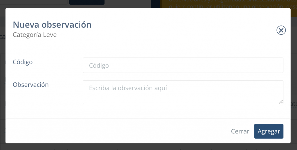 AGREGAR: Pinchando en el botón verde de agregar nueva observación se pueden incorporar nuevas observaciones asociadas a una categoría, agregando el código y la observación.