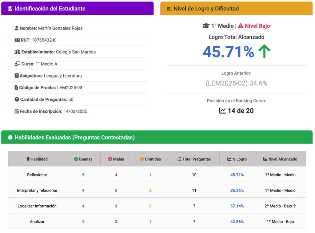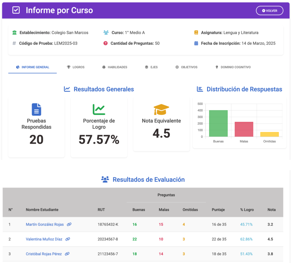 - Ofrece informes para planificar estrategias pedagógicas para cada estudiante o para el curso.